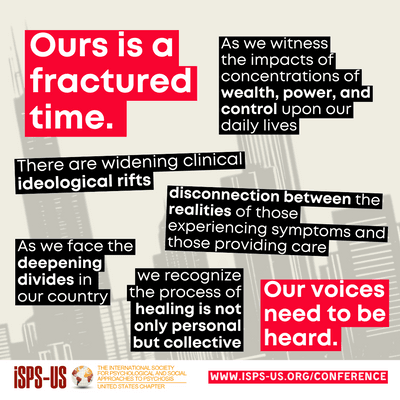 The ISPS-US 24th Annual Conference will offer an opportunity to hold these responses together in community, and to explore ways to address and transcend their interlocking reverberations in psyche, family, and society. Through dialogue, collaboration, and advocacy, we will work to bridge the gaps between perspectives, disciplines, and lived realities in psychosis care and beyond.