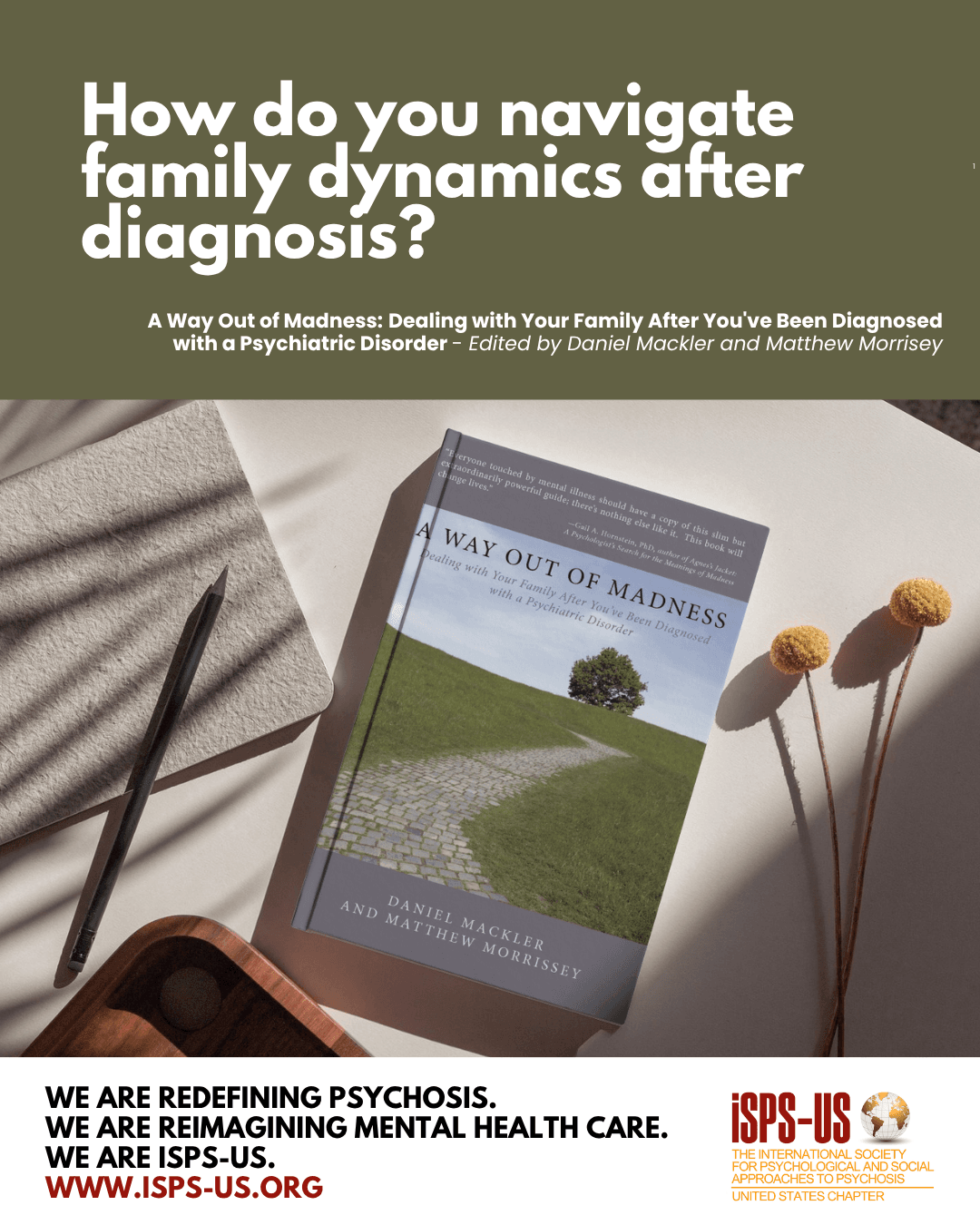 In 2010, ISPS-US and a collection of authors self-published the book "A Way Out of Madness: Dealing with Your Family After You've Been Diagnosed with a Psychiatric Disorder," edited by Daniel Mackler and Matthew Morrisey. It is available for purchase on Amazon.